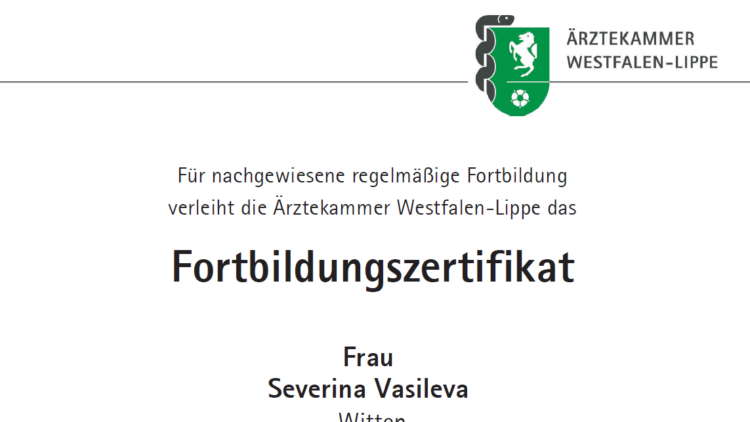 Unsere allgemeinmedizinische Praxis freut sich sehr, bekanntzugeben, dass eine unserer Ärztinnen erfolgreich das offizielle Fortbildungszertifikat der Ärztekammer Westfalen Lippe erhalten hat. Dieses Zertifikat bestätigt, dass Severina Vasileva...